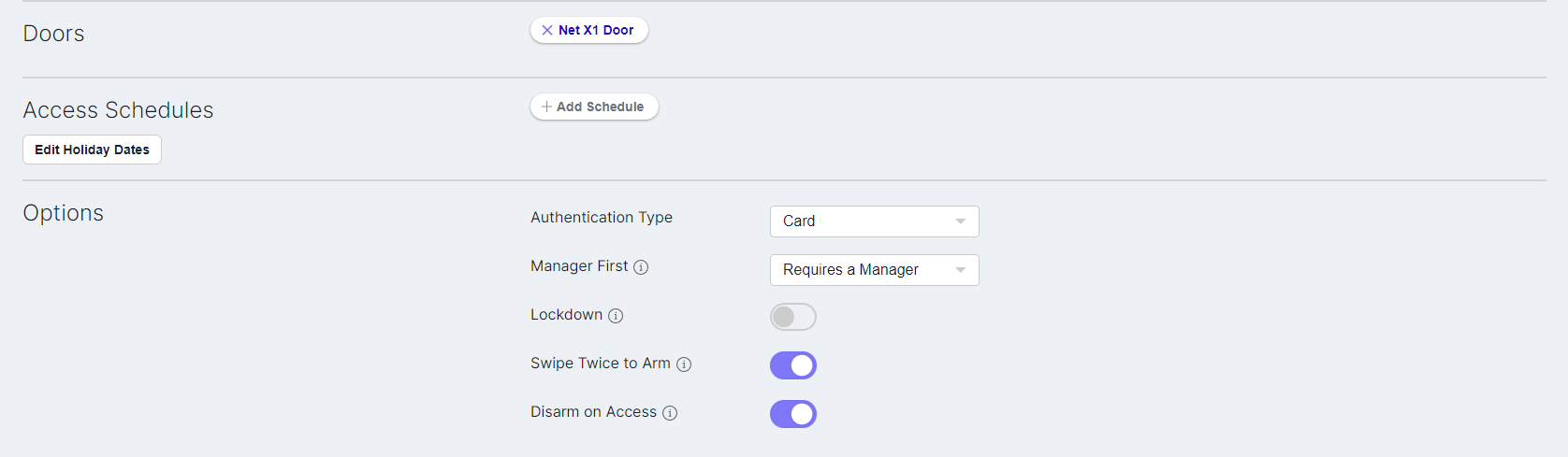 Swipe Twice to Arm: Allow group members to swipe twice at any door in this group to arm the alarm panel.